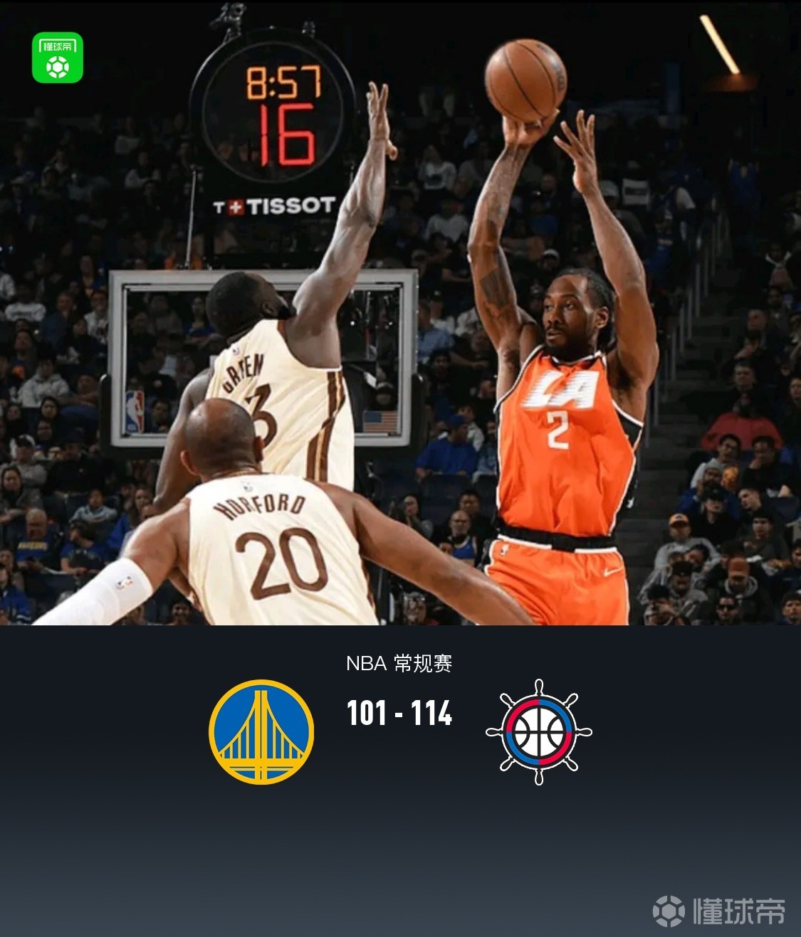 快船114-101逆转勇士,伦纳德23+8,加兰首秀12分,波杰姆斯基22+7