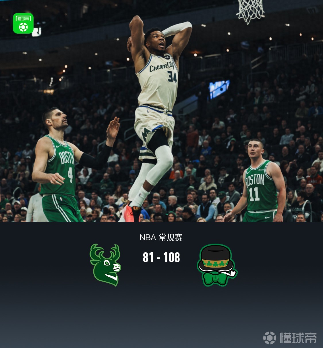 北京时间3月3日NBA 常规赛,密尔沃基雄鹿对阵波士顿凯尔特人。半场雄鹿43-57凯尔特人,最终雄鹿81-108凯尔特人。