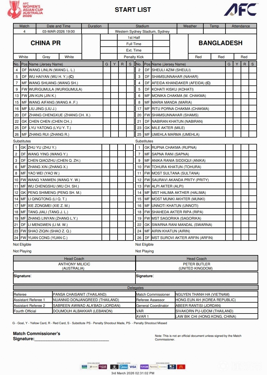 孟加拉国女足首发:23-迈勒-阿克特、5-科哈蒂-基斯库、21-纳比兰-卡图恩、4-阿菲达-普兰蒂、3-沙姆松娜哈尔、2-谢乌莉-阿齐姆、25-乌梅拉-马尔马、20-小沙姆松娜哈尔、17-丽图-沙克马、8-玛丽亚-曼达、6-莫妮卡-沙克马